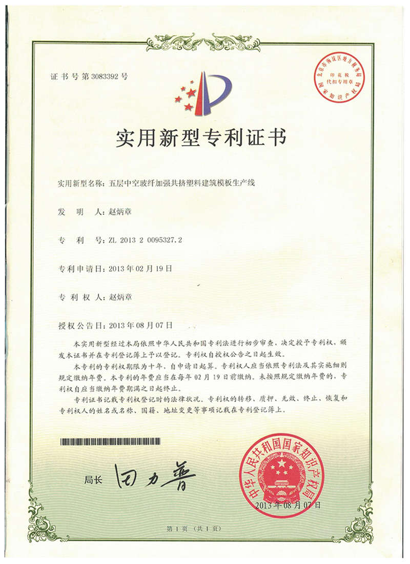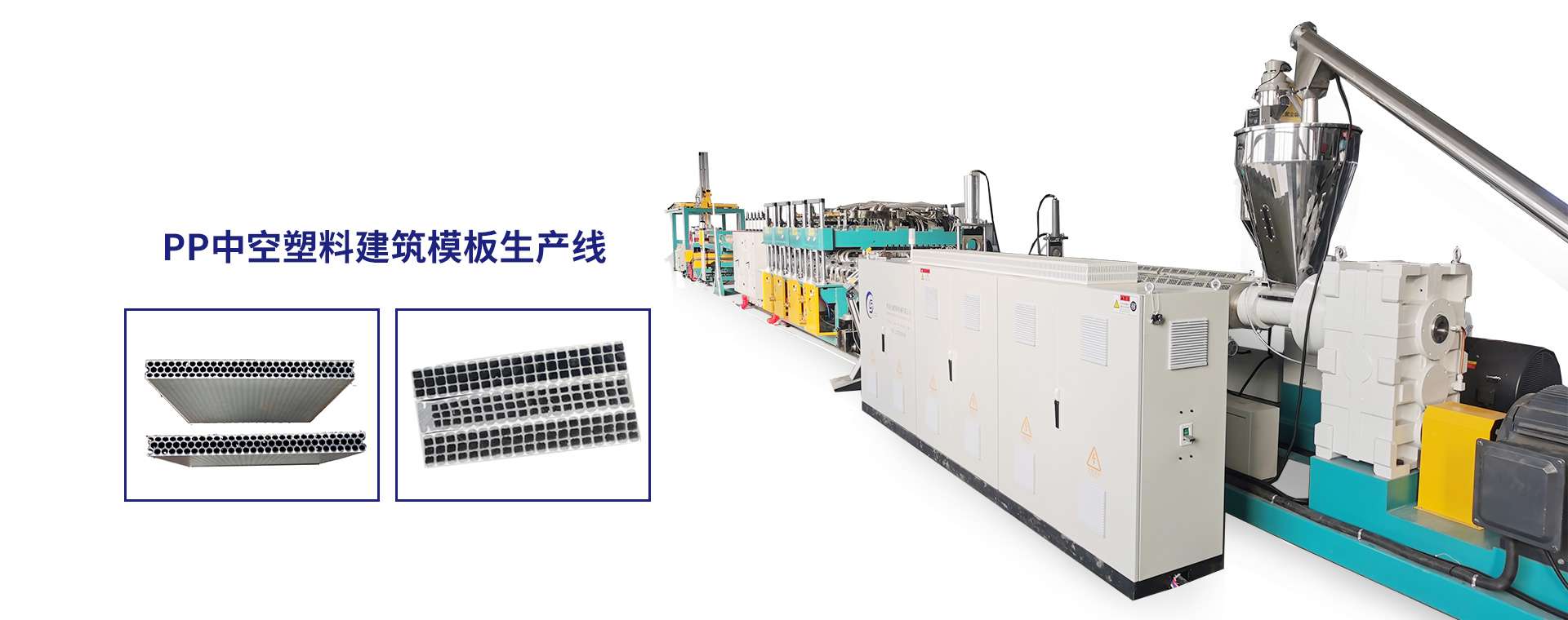 中空模板生產線/中空板設備由自動上料進入高速混料、再自動上料到雙螺桿擠出機、由大板模具結構出料進行四節定型模定型、排輥托冷裝置、裁邊裝置、牽引機、自動切割機、排輥輸送機等組成